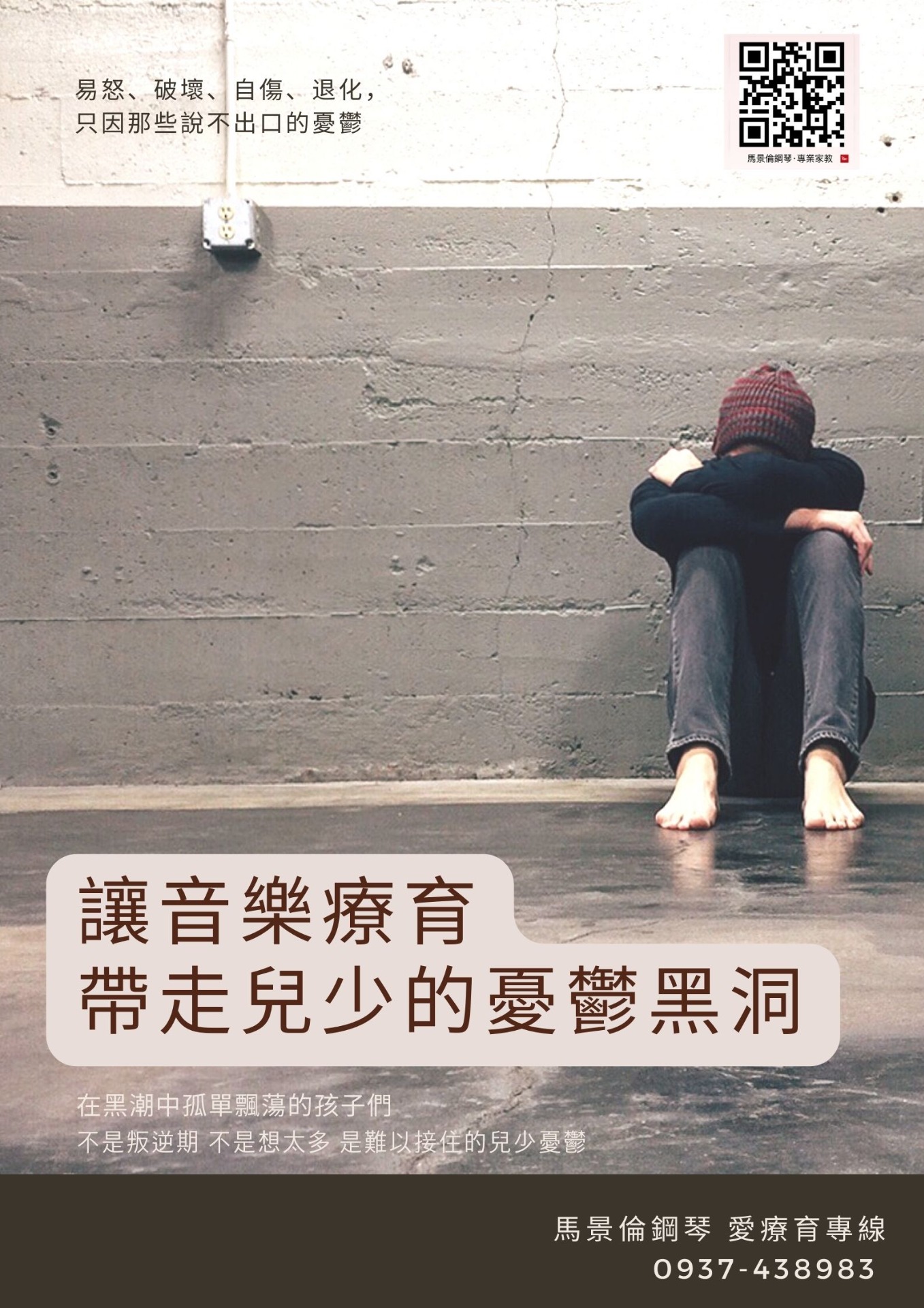 親愛的父母,你的孩子正在黑潮中孤單飄蕩?他/她不是叛逆期、不是想太多,而是難以接住的兒少憂鬱,未來的連鎖反應,必須即早面對,接受音樂療育,需要專業,更需要您的陪伴,讓我們一起努力協助兒少走出憂鬱黑洞。